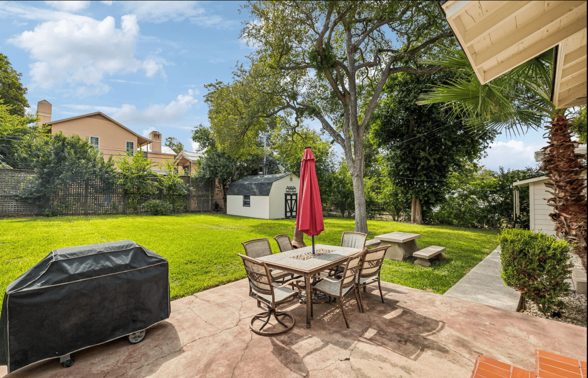 Mature trees add shade and a sense of privacy potential, turning the yard into a canvas for whatever outdoor lifestyle you want to create next.