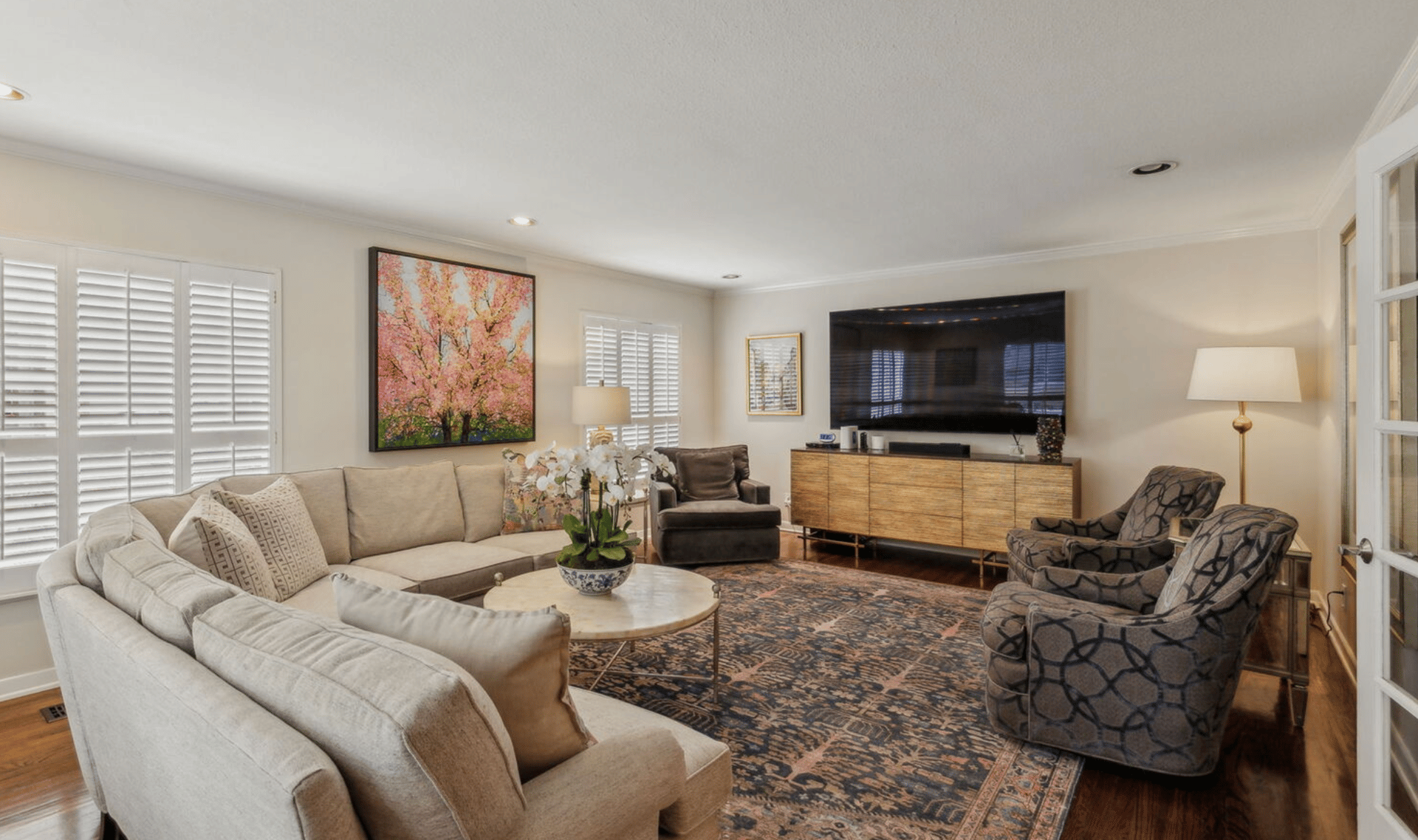 An oversized living room with generous seating options and natural light