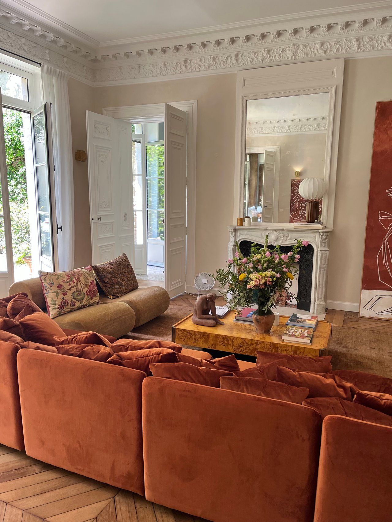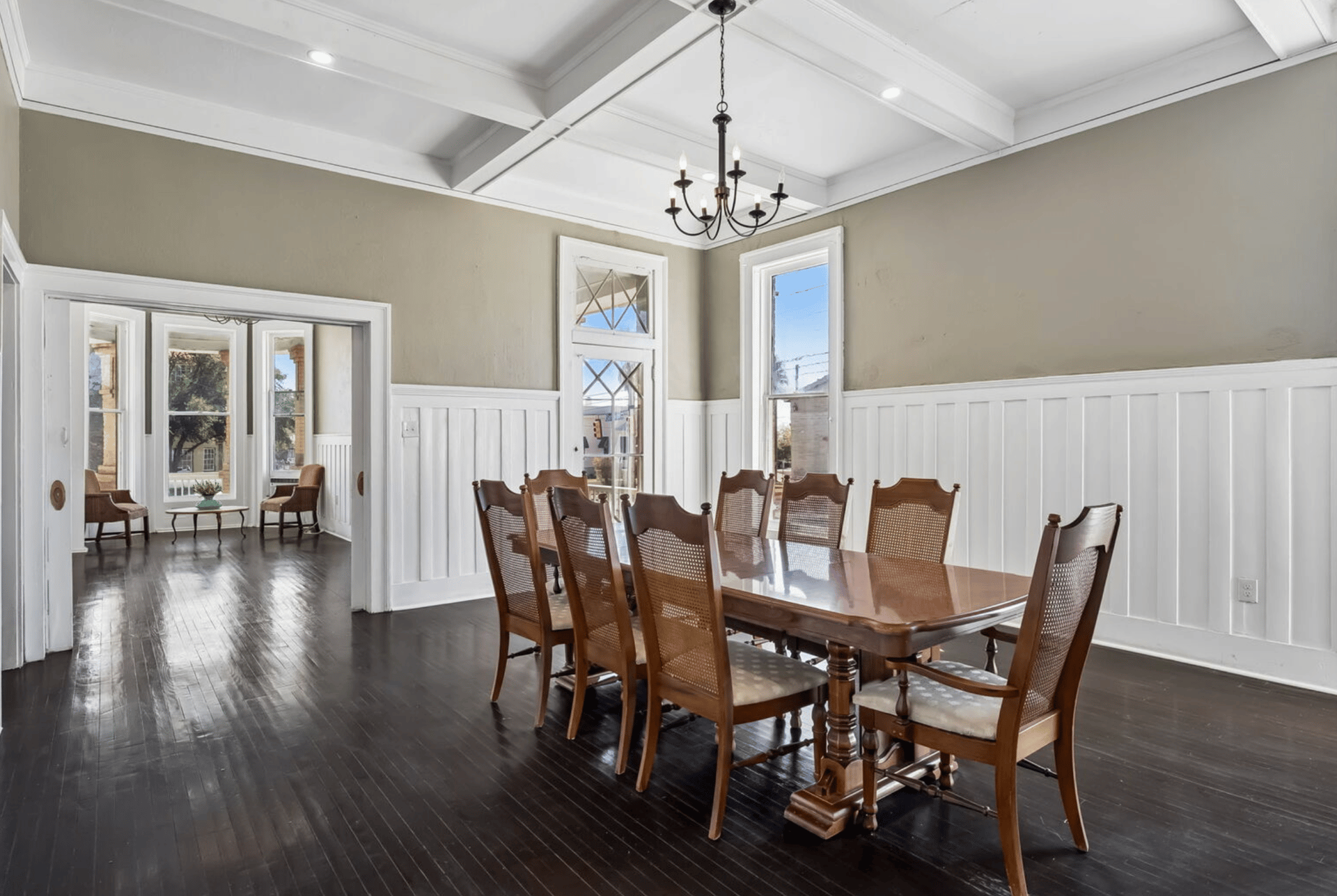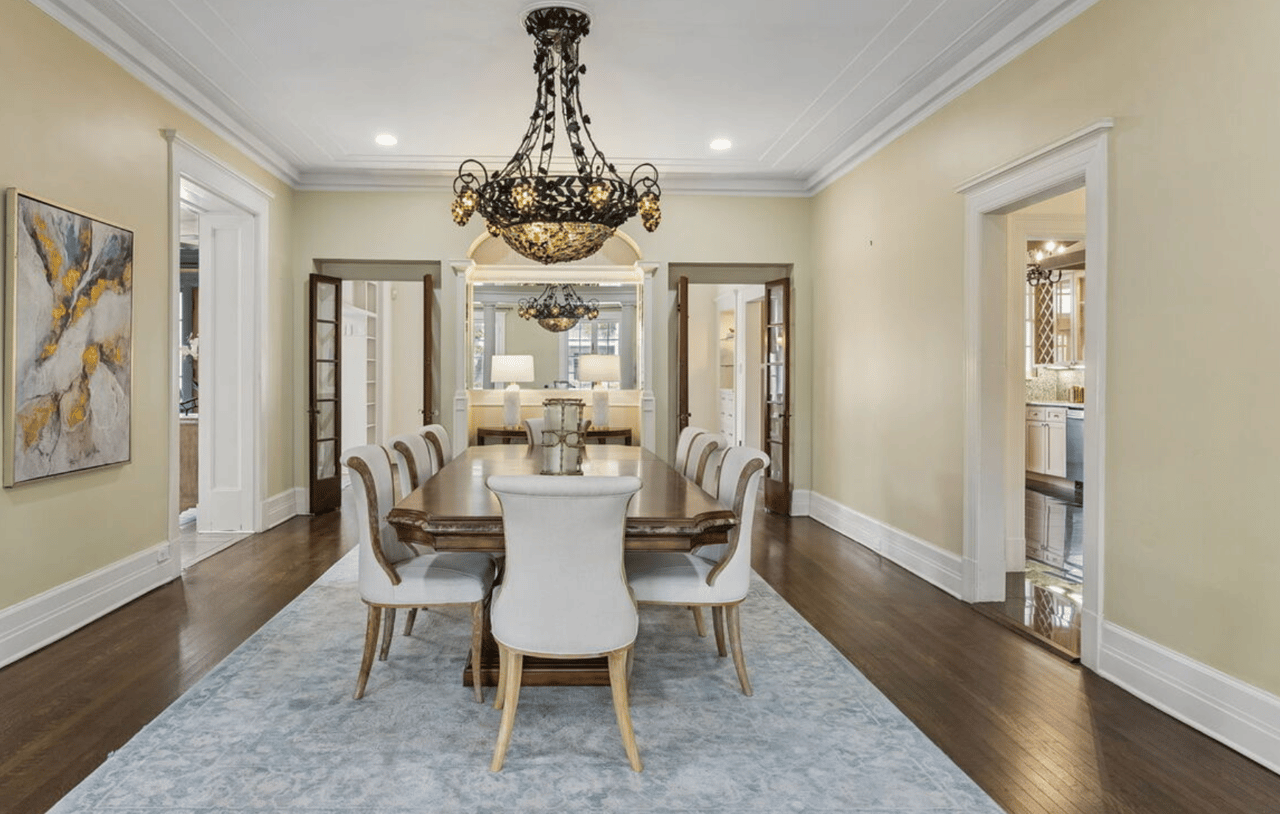Inside, the home is defined by its scale and flexibility. Three living areas, a separate dining room, and multiple additional spaces create a layout that accommodates both everyday living and larger gatherings. High ceilings and floor-to-ceiling windows allow for natural light throughout, while interior features such as wood flooring, multiple fireplaces, and detailed millwork contribute to the home’s character.