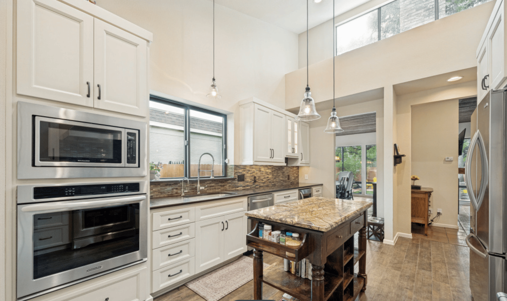 Living here is less about defined rooms and more about how the spaces interact. Two separate living areas create opportunities for both formal and casual gathering, while the dining room and kitchen flow naturally together—ideal for everyday living as well as entertaining. High ceilings enhance the sense of volume, and a fireplace provides a natural focal point, reinforcing the home’s comfortable, livable design.
