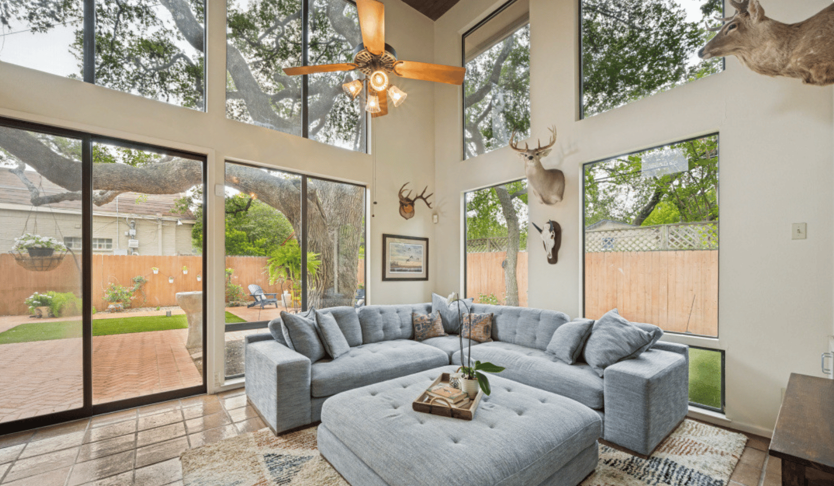 From the moment you step inside, the architecture begins to unfold with intention. Expansive walls of glass draw your eye outward, framing views of a private brick patio and fountain—an element that immediately sets this home apart from other homes for sale in Northwood San Antonio. Natural light fills the interiors throughout the day, enhancing the sense of openness while creating a warm, inviting atmosphere. Saltillo tile floors anchor the space with texture and character, offering a style that feels both authentic and enduring.