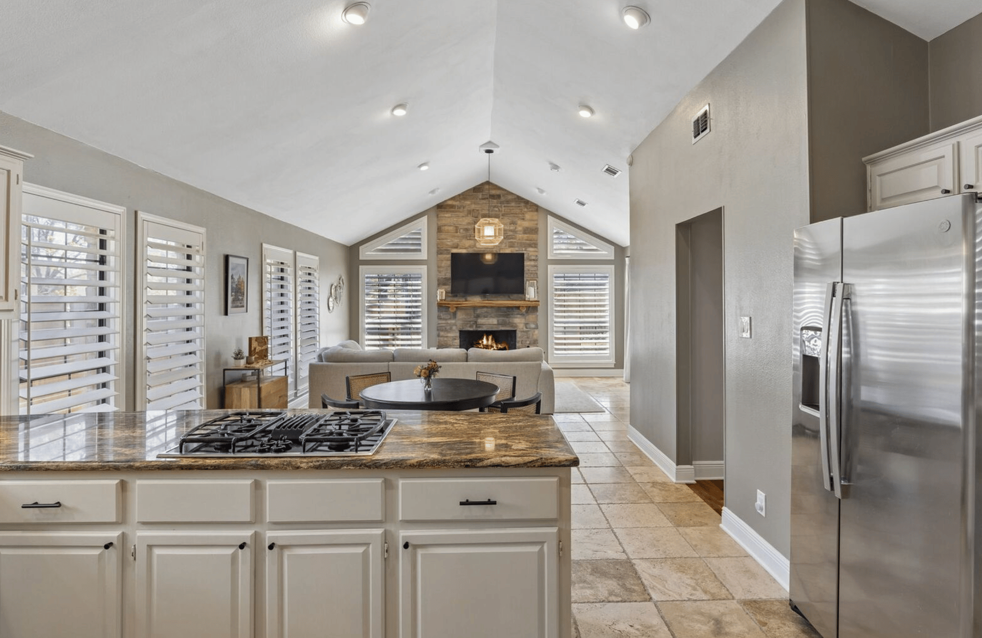 High ceilings and natural light open up the interior, while skylights and a central fireplace add warmth and character throughout the day, creating an overall flow that feels easy and intuitive.